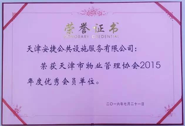 kaiyun开云电竞荣获天津市物业管理协会2015年度优秀会员单位称号
