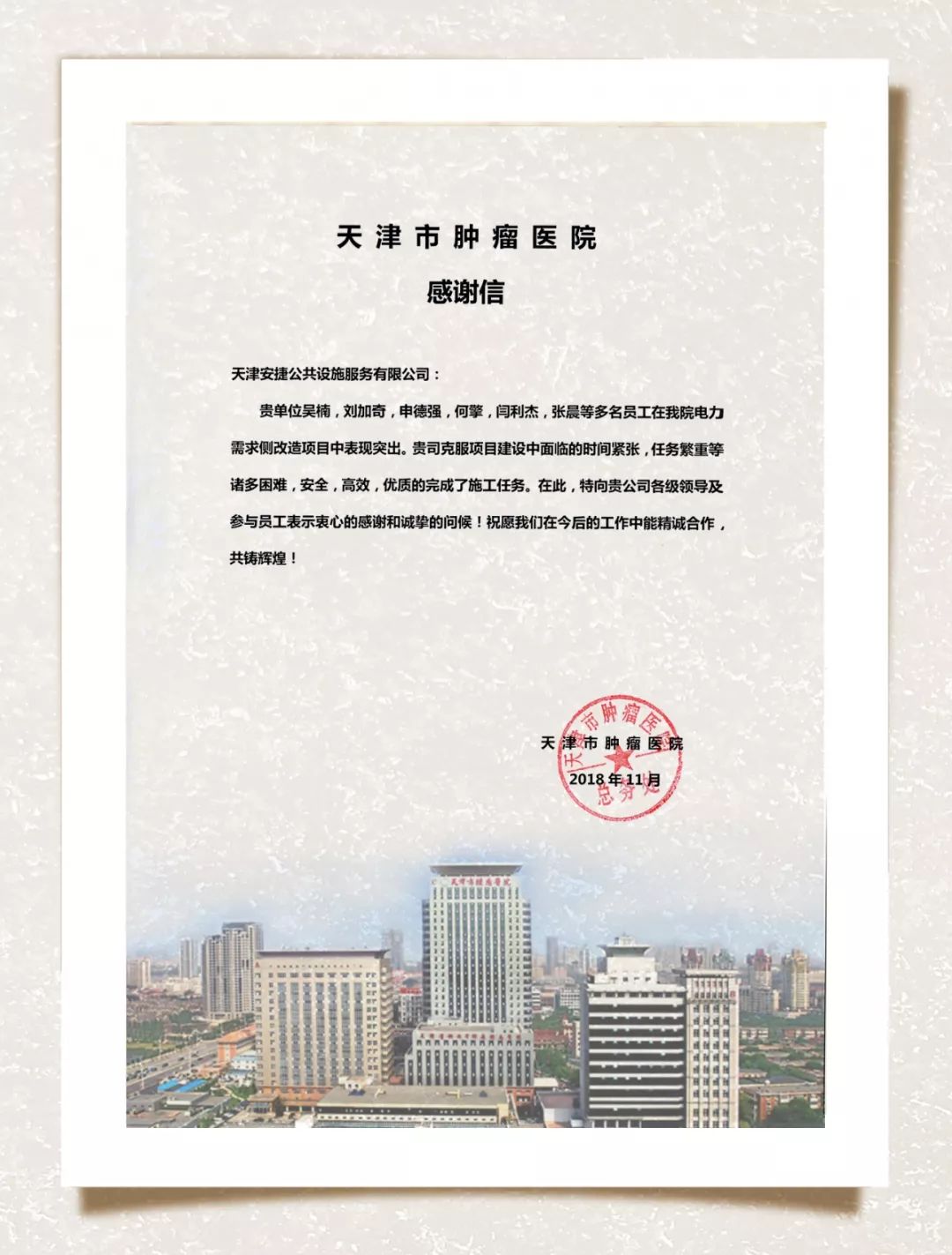 近日,kaiyun开云电竞收到了一封来自天津市肿瘤医院的《感谢信》。信中肯定了kaiyun开云电竞在电力需求侧改造项目中的突出表现。改造过程中kaiyun开云电竞克服了诸多困难,最终安全高效、保质保量地完成了施工任务,得到了天津市肿瘤医院的高度赞扬。