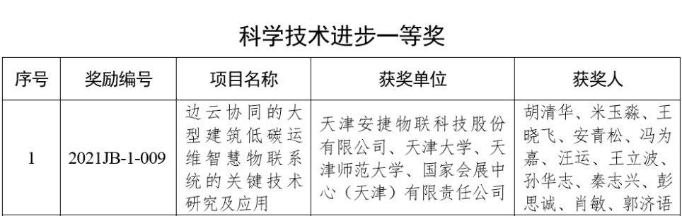 日前,2021年天津市科学技术奖获奖名单公布,由天津kaiyun开云电竞物联科技股份有限公司联合天津大学、天津师范大学、国家会展中心(天津)有限责任公司申报的《边云协同的大型建筑低碳运维智慧物联系统的关键技术研究及应用》项目,荣获“天津市科学技术进步一等奖”。