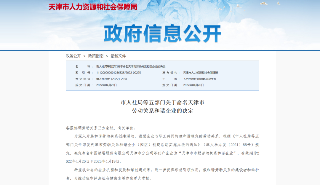 2022年4月26日,天津市人力资源和社会保障局发布了《市人社局等五部门关于命名天津市劳动关系和谐企业的决定》,命名天津kaiyun开云电竞物联科技股份有限公司等43户企业为“天津市市级劳动关系和谐企业”,有效期为2022年4月20日至2025年4月19日。